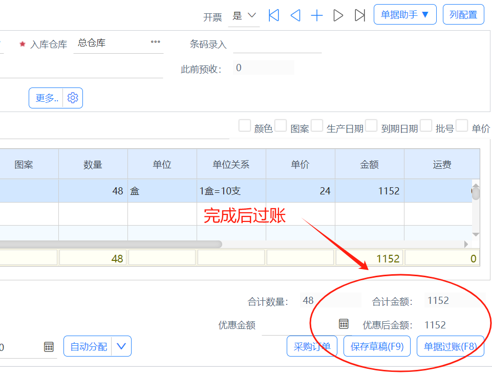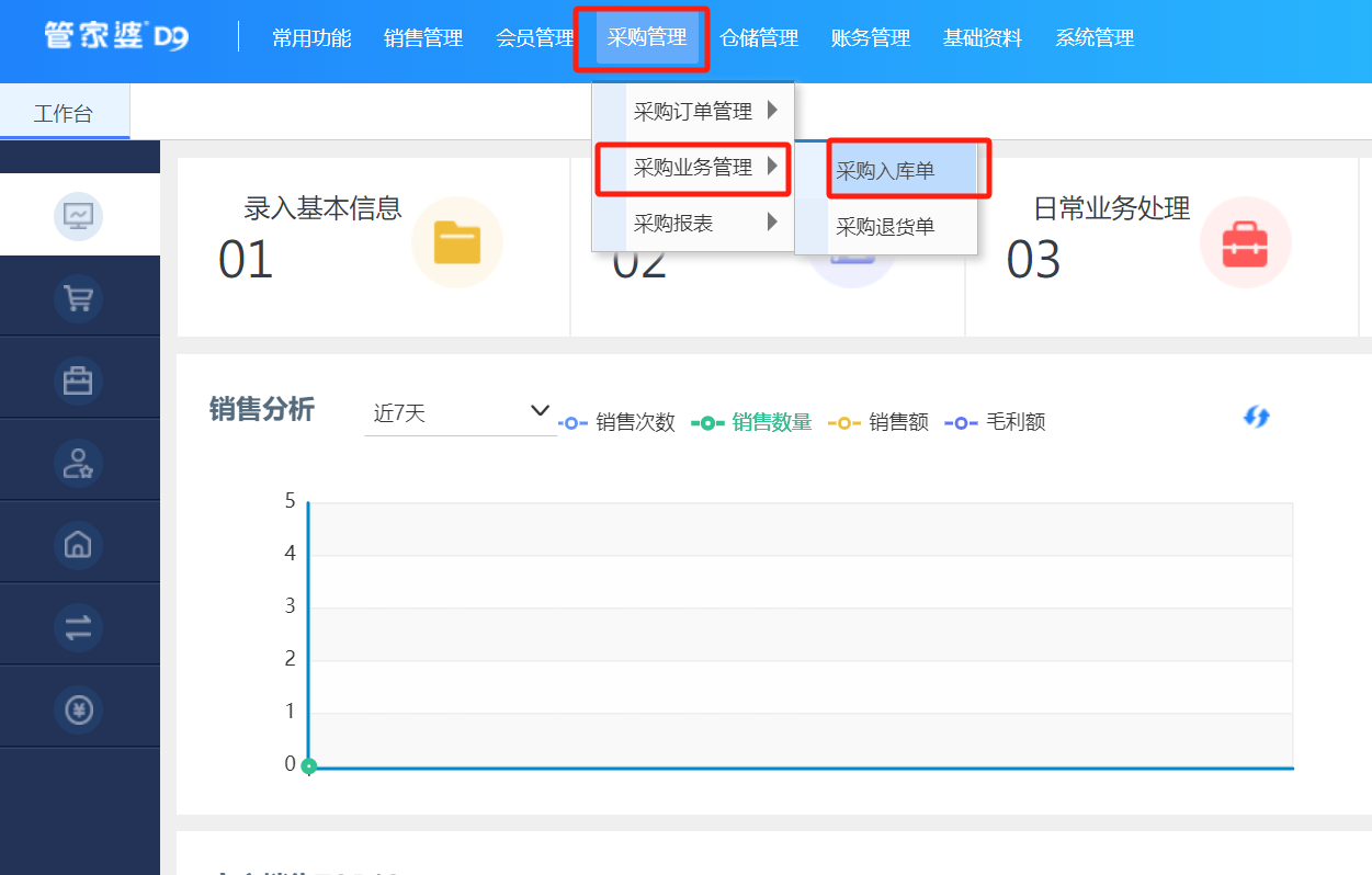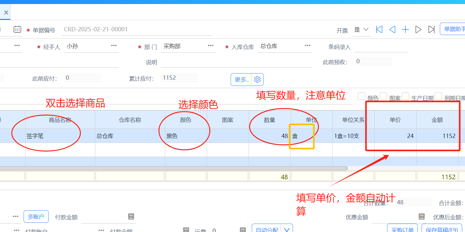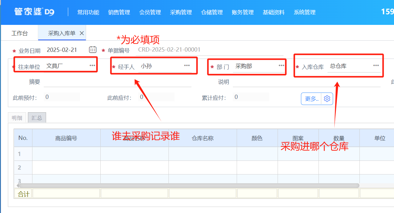 在武汉管家婆进销存软件中制作采购入库单的步骤如下: